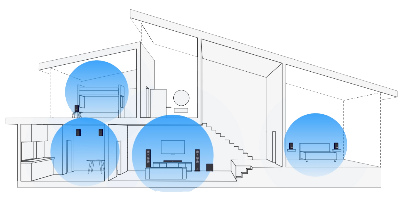 Динамики можно легко перемещать и настраивать в любой части дома без ограничений по кабелям.